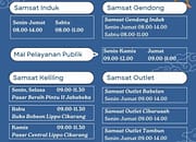 Sementara itu, Samsat Gendong Induk memiliki jam operasional yang sama, yakni Senin hingga Jumat pukul 08.00–14.00 WIB dan Sabtu pukul 08.00–11.00 WIB.